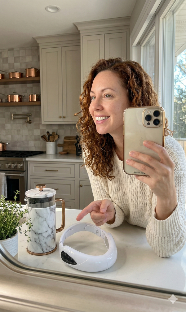 "Love the futuristic design! It looks like something out of a sci-fi movie, but it genuinely works for me. The gentle micro-vibrations are super relaxing. I actually started seeing a subtle lifting effect and a lot less morning puffiness after just 3 weeks of daily use. Because it's completely hands-free, I just wear it while answering morning emails."